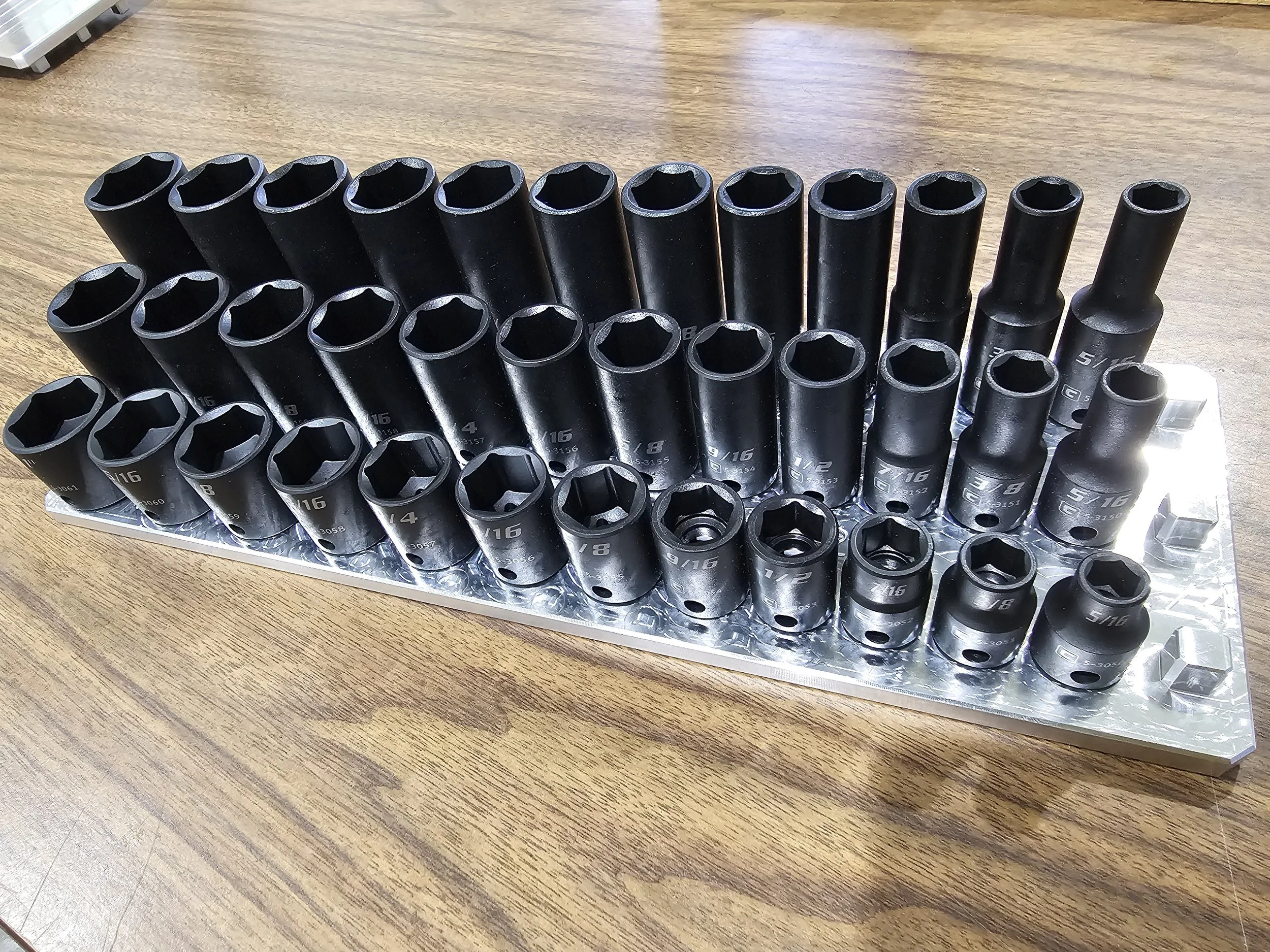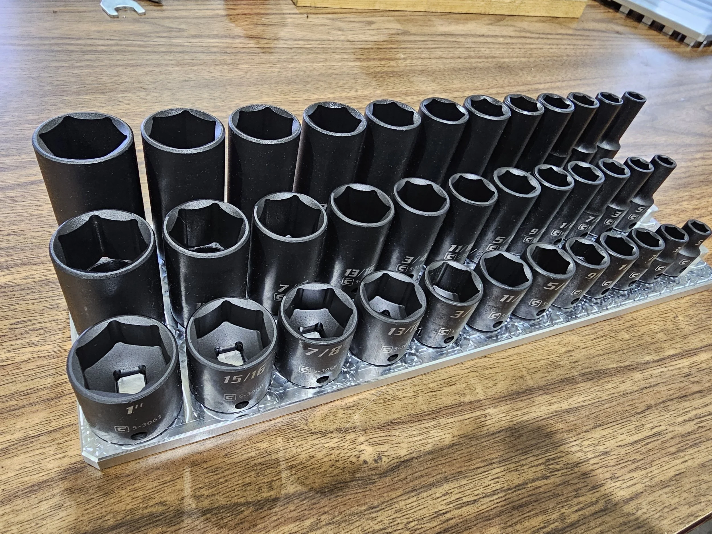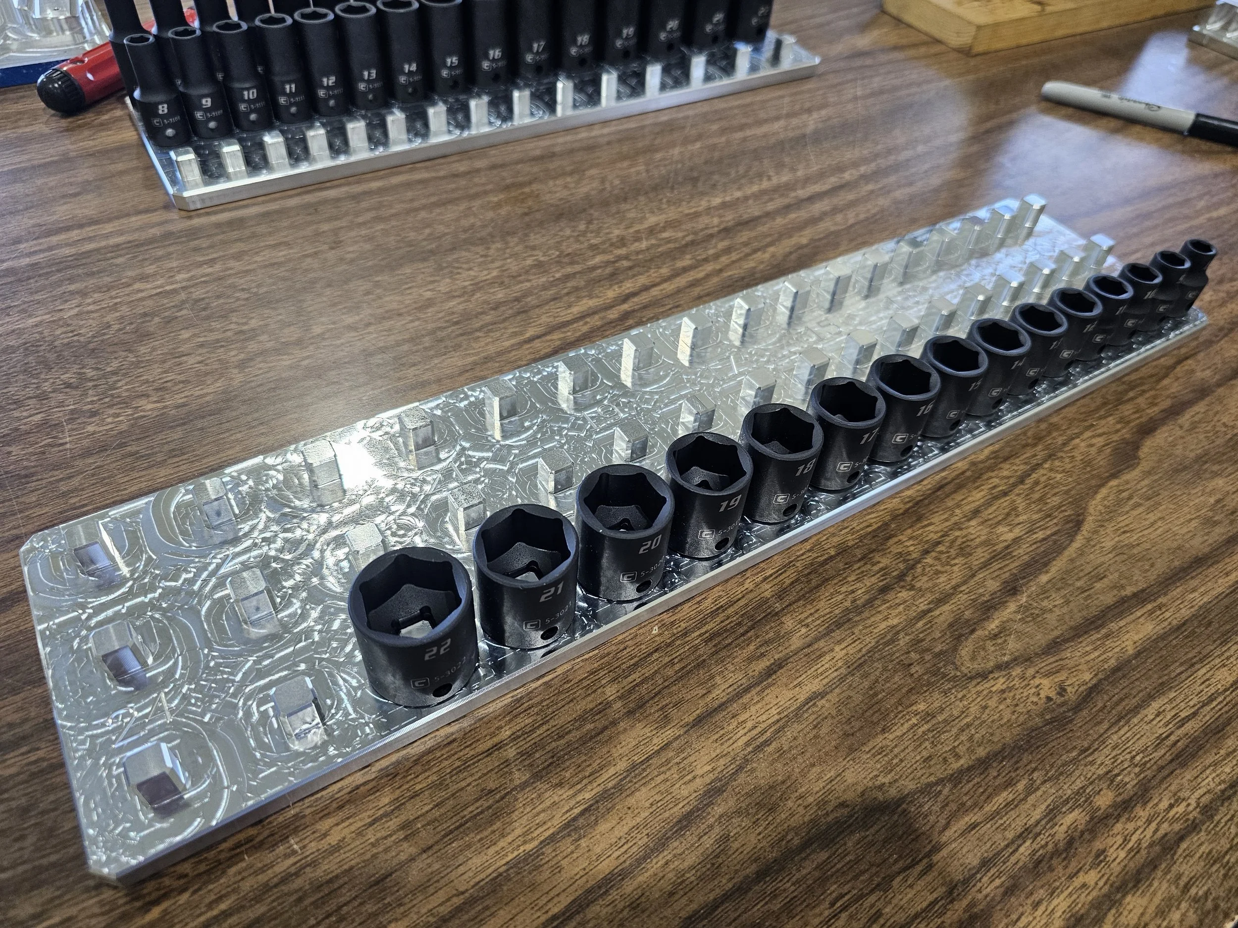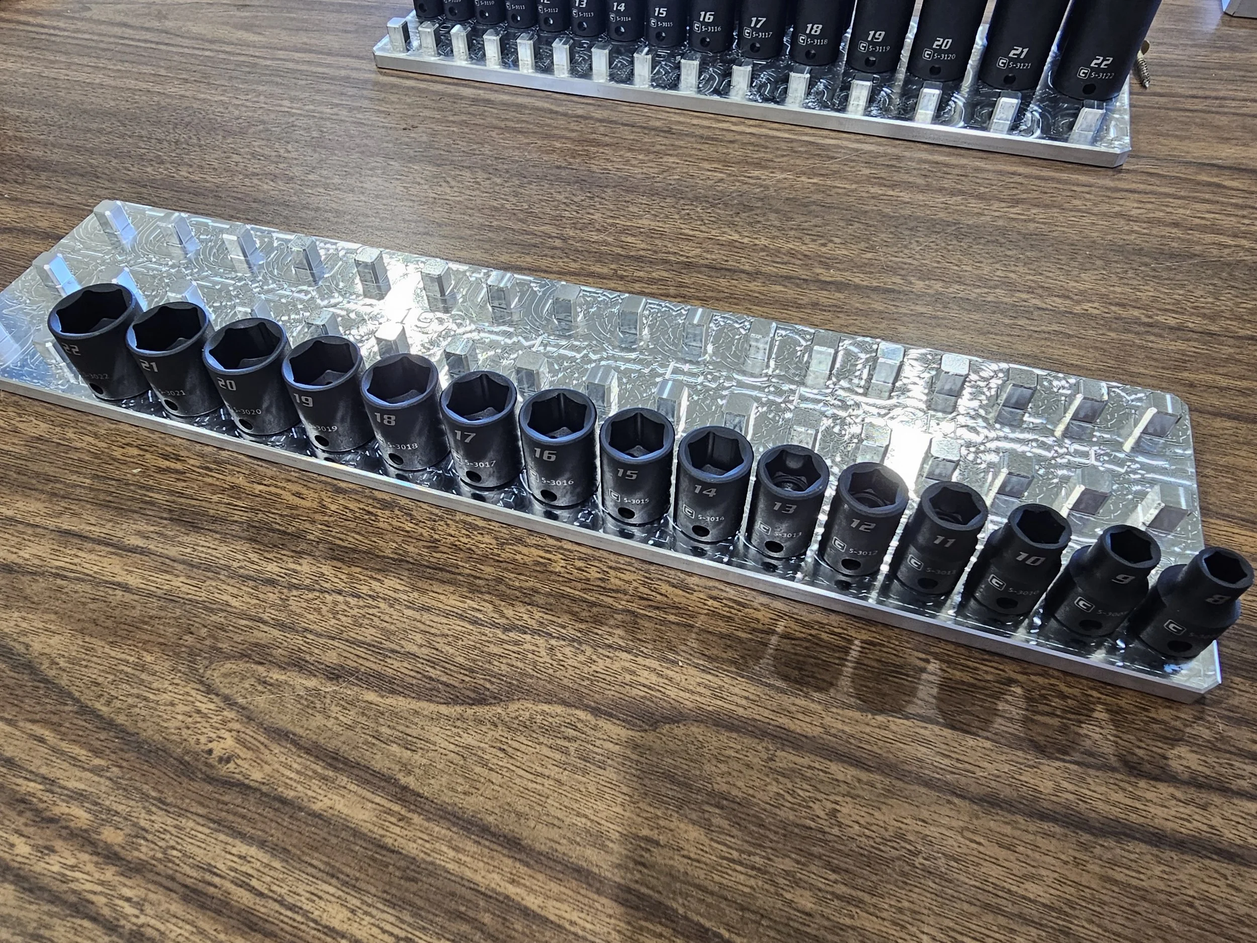 MACHINE IS BACK RUNNING. I WILL HAVE LIMITED STOCK FOR THE NEXT COUPLE WEEKS. THANK YOU TO ALL MY CUSTOMERS Categories: All WRENCH ORGANIZATION TORQUE WRENCH ORGANIZATION EXTENSION ORGANIZATION SOCKET ORGANIZATION All | WRENCH ORGANIZATION | TORQUE WRENCH ORGANIZATION | EXTENSION ORGANIZATION | SOCKET ORGANIZATION | 3/8 & 1/2 Organizer $32.00 Sold out VIM Tools DTPM100 $36.00 20 PC Wrench Organizer ( 2 PC ) $35.00 4 x 10 1/4 Drive Organizer $35.00 1/4 - 2 Row Socket Organizer $26.00 1/4 - 3 ROW SOCKET ORGANIZER $28.00 1/4 - 4 ROW SOCKET ORGANIZER $32.00 3/8 - 2 Row SAE $36.00 3/8 - 2 Row ( METRIC & SAE ) ORGANIZER $60.00 3/8 - 3 Row 8-22MM Socket Organizer $50.00 3/8" - 3 Row 8 - 24 (METRIC) SOCKET ORGANIZER $55.00 3/8 - 3 ROW ( SAE ) SOCKET ORGANIZER $45.00 3/8 - 3 ROW 6-20MM SOCKET ORGANIZER $45.00 3/8 - 3 ROW ( METRIC & SAE ) SOCKET ORGANIZER $80.00 1/2" - 2 ROW ( SAE ) SOCKET ORGANIZER $55.00 1/2" 2 Row ( SAE ) with 1-3/16" ( 15pc ) $55.00 Sold out 1/2" SAE 1-5/16 - 1-5/8 $42.00 Sold out 1/2" - 2 ROW 10-27 ( SKIPS 26 ) Socket Organizer $60.00 1/2" 28 - 36 Metric Socket Organizer $42.00 Blue Point BLPTHC87 Organizer $80.00 Cornwell CBSMTH62S - 62 Piece Hex & Star Bit Organizer $55.00 6" x 6" 1/4 & 3/8 Billet Aluminum Organizer $38.00 Sold out 6" x 6" 3/8 Billet Aluminum Organizer $32.00 6" x 6" Multi Billet Aluminum Organizer $32.00 Billet Aluminum organizer for 204fihc $40.00 Sold out 1/4 Extenion Tray for Icon extensions $35.00 Sold out 1/4 Extension Tray SNAP-ON $36.00 Sold out 1/4 & 3/8 Extension Tray SNAP-ON $60.00 3/8 Extension Tray SNAP-ON $36.00 3/8 Extension Tray for Icon $36.00 Sold out 3/8 Extension Tray Matco 5pc $36.00 Sold out 1/2" Extension Tray SNAP-ON $38.00 Digital Torque Wrench Tray (2Pc) $80.00 Digital Torque Wrench Tray (3 Pc) $140.00 Low Profile Socket Organizer for Snap On sockets $36.00 3/8 Low Profile $46.00 Sold out Tap Socket Holder $30.00 Sold out
