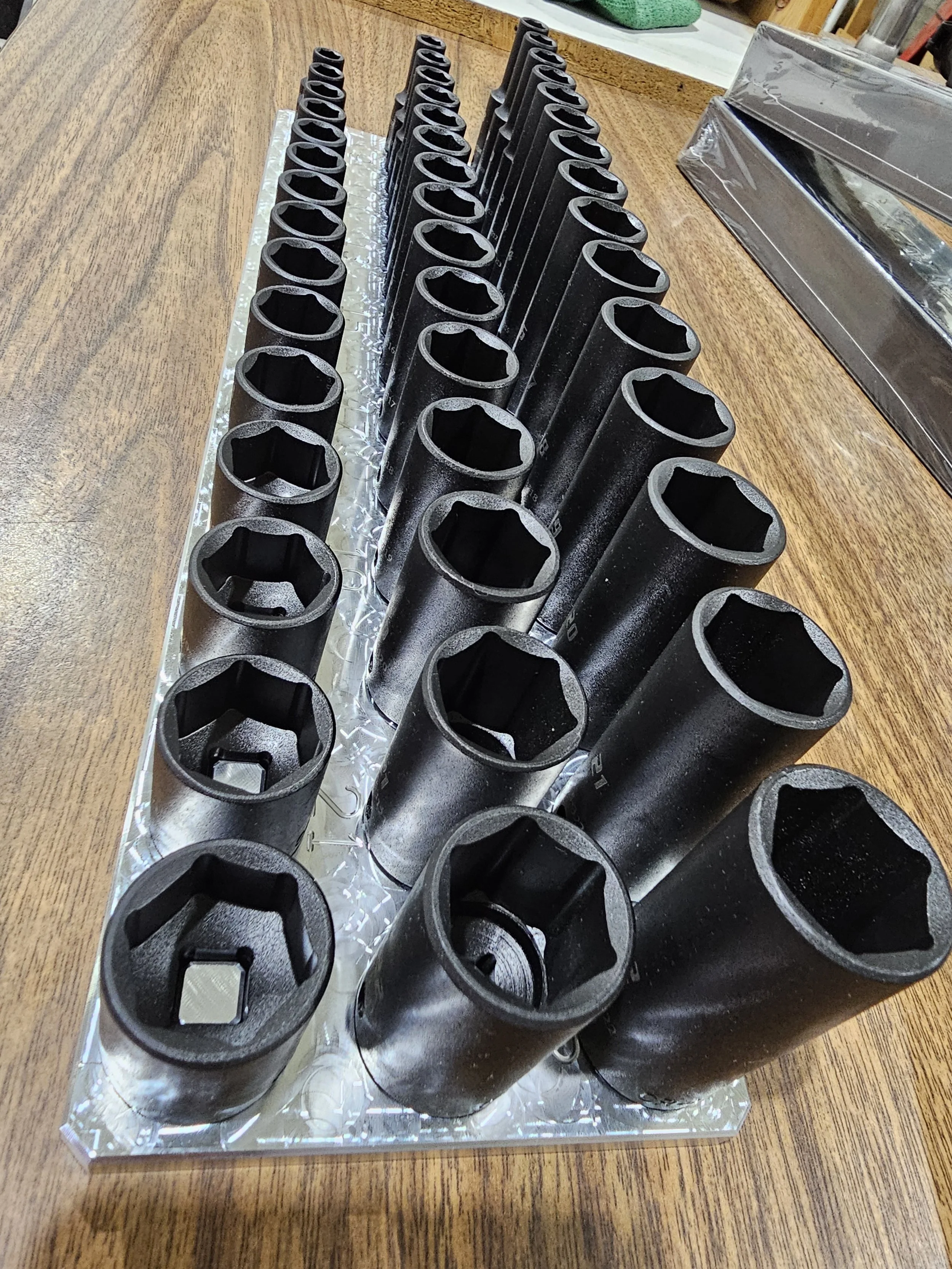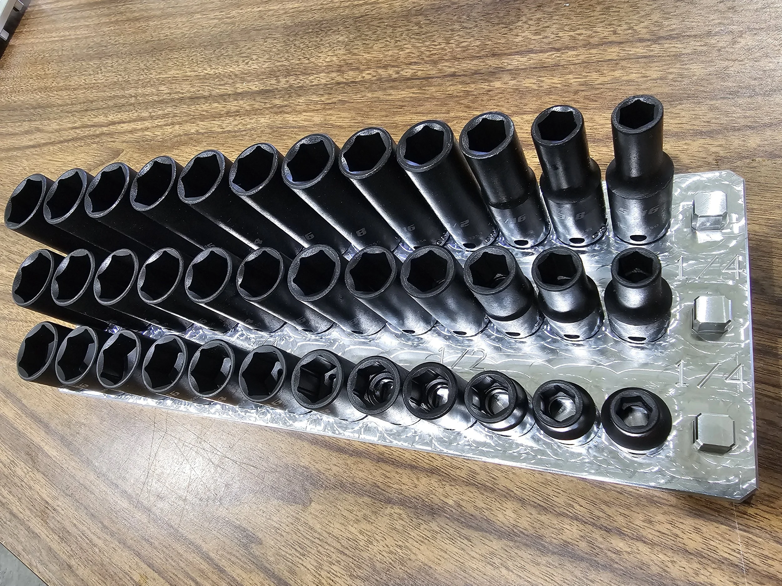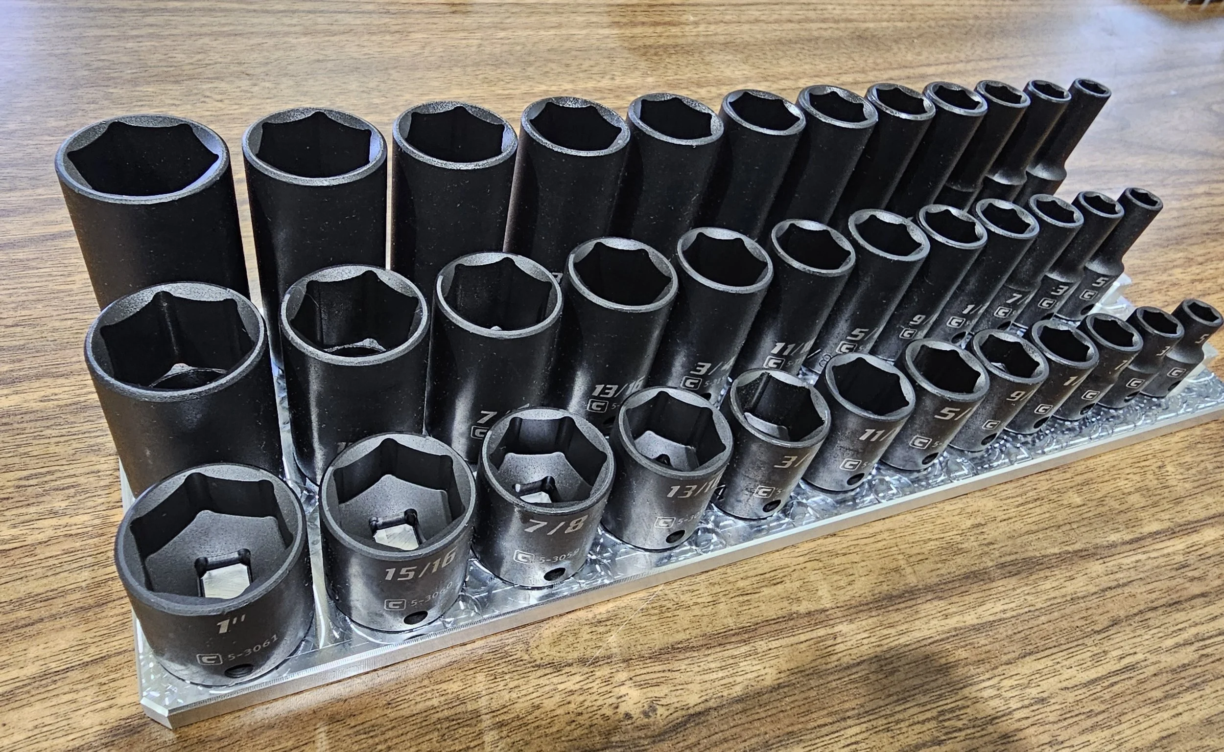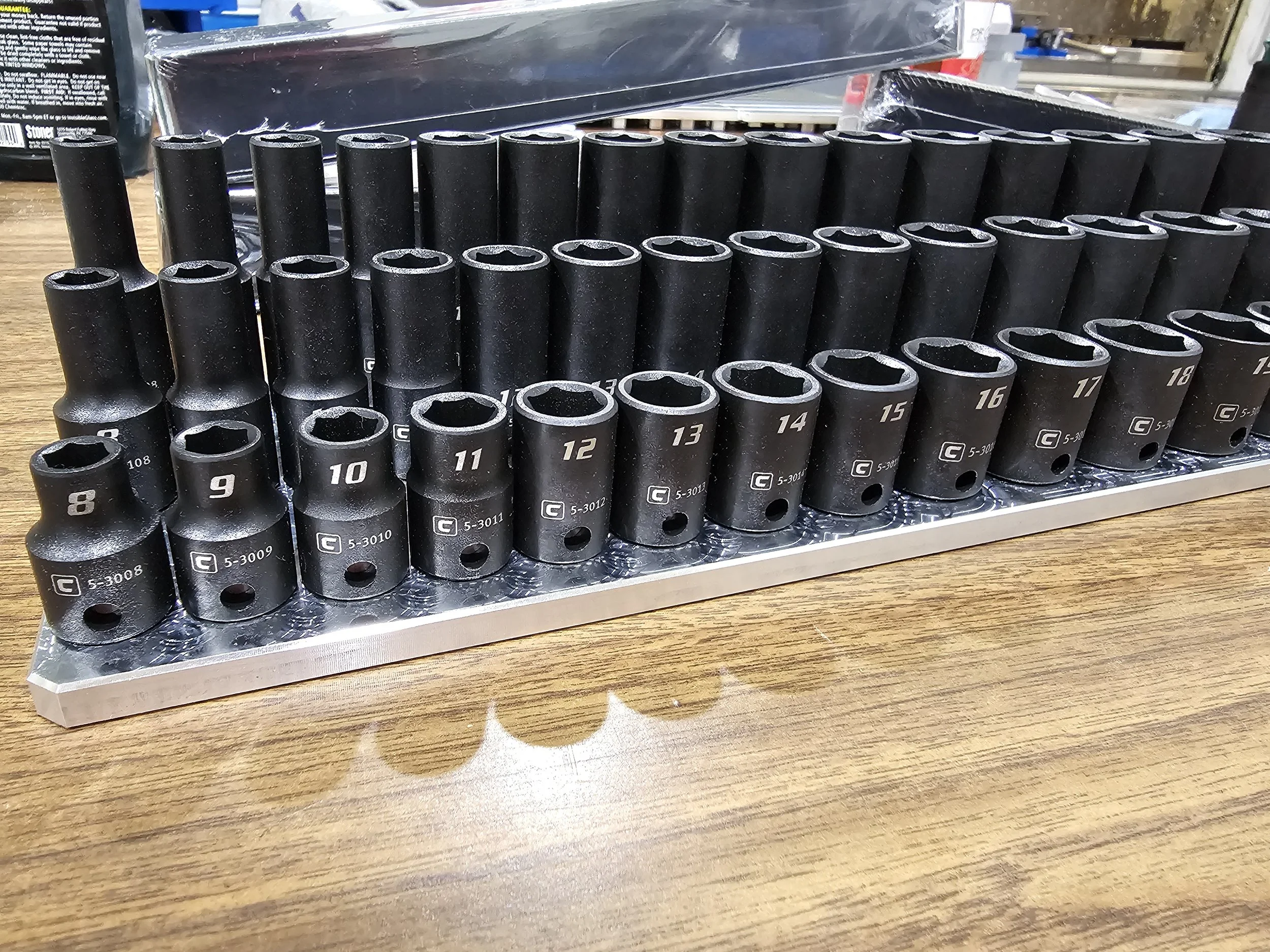 MACHINE IS BACK RUNNING. I WILL HAVE LIMITED STOCK FOR THE NEXT COUPLE WEEKS. THANK YOU TO ALL MY CUSTOMERS Categories: All WRENCH ORGANIZATION TORQUE WRENCH ORGANIZATION EXTENSION ORGANIZATION SOCKET ORGANIZATION All | WRENCH ORGANIZATION | TORQUE WRENCH ORGANIZATION | EXTENSION ORGANIZATION | SOCKET ORGANIZATION | 3/8 & 1/2 Organizer $32.00 Sold out VIM Tools DTPM100 $36.00 20 PC Wrench Organizer ( 2 PC ) $35.00 4 x 10 1/4 Drive Organizer $35.00 1/4 - 2 Row Socket Organizer $26.00 1/4 - 3 ROW SOCKET ORGANIZER $28.00 1/4 - 4 ROW SOCKET ORGANIZER $32.00 3/8 - 2 Row SAE $36.00 3/8 - 2 Row ( METRIC & SAE ) ORGANIZER $60.00 3/8 - 3 Row 8-22MM Socket Organizer $50.00 3/8" - 3 Row 8 - 24 (METRIC) SOCKET ORGANIZER $55.00 3/8 - 3 ROW ( SAE ) SOCKET ORGANIZER $45.00 3/8 - 3 ROW 6-20MM SOCKET ORGANIZER $45.00 3/8 - 3 ROW ( METRIC & SAE ) SOCKET ORGANIZER $80.00 1/2" - 2 ROW ( SAE ) SOCKET ORGANIZER $55.00 1/2" 2 Row ( SAE ) with 1-3/16" ( 15pc ) $55.00 Sold out 1/2" SAE 1-5/16 - 1-5/8 $42.00 Sold out 1/2" - 2 ROW 10-27 ( SKIPS 26 ) Socket Organizer $60.00 1/2" 28 - 36 Metric Socket Organizer $42.00 Blue Point BLPTHC87 Organizer $80.00 Cornwell CBSMTH62S - 62 Piece Hex & Star Bit Organizer $55.00 6" x 6" 1/4 & 3/8 Billet Aluminum Organizer $38.00 Sold out 6" x 6" 3/8 Billet Aluminum Organizer $32.00 6" x 6" Multi Billet Aluminum Organizer $32.00 Billet Aluminum organizer for 204fihc $40.00 Sold out 1/4 Extenion Tray for Icon extensions $35.00 Sold out 1/4 Extension Tray SNAP-ON $36.00 Sold out 1/4 & 3/8 Extension Tray SNAP-ON $60.00 3/8 Extension Tray SNAP-ON $36.00 3/8 Extension Tray for Icon $36.00 Sold out 3/8 Extension Tray Matco 5pc $36.00 Sold out 1/2" Extension Tray SNAP-ON $38.00 Digital Torque Wrench Tray (2Pc) $80.00 Digital Torque Wrench Tray (3 Pc) $140.00 Low Profile Socket Organizer for Snap On sockets $36.00 3/8 Low Profile $46.00 Sold out Tap Socket Holder $30.00 Sold out