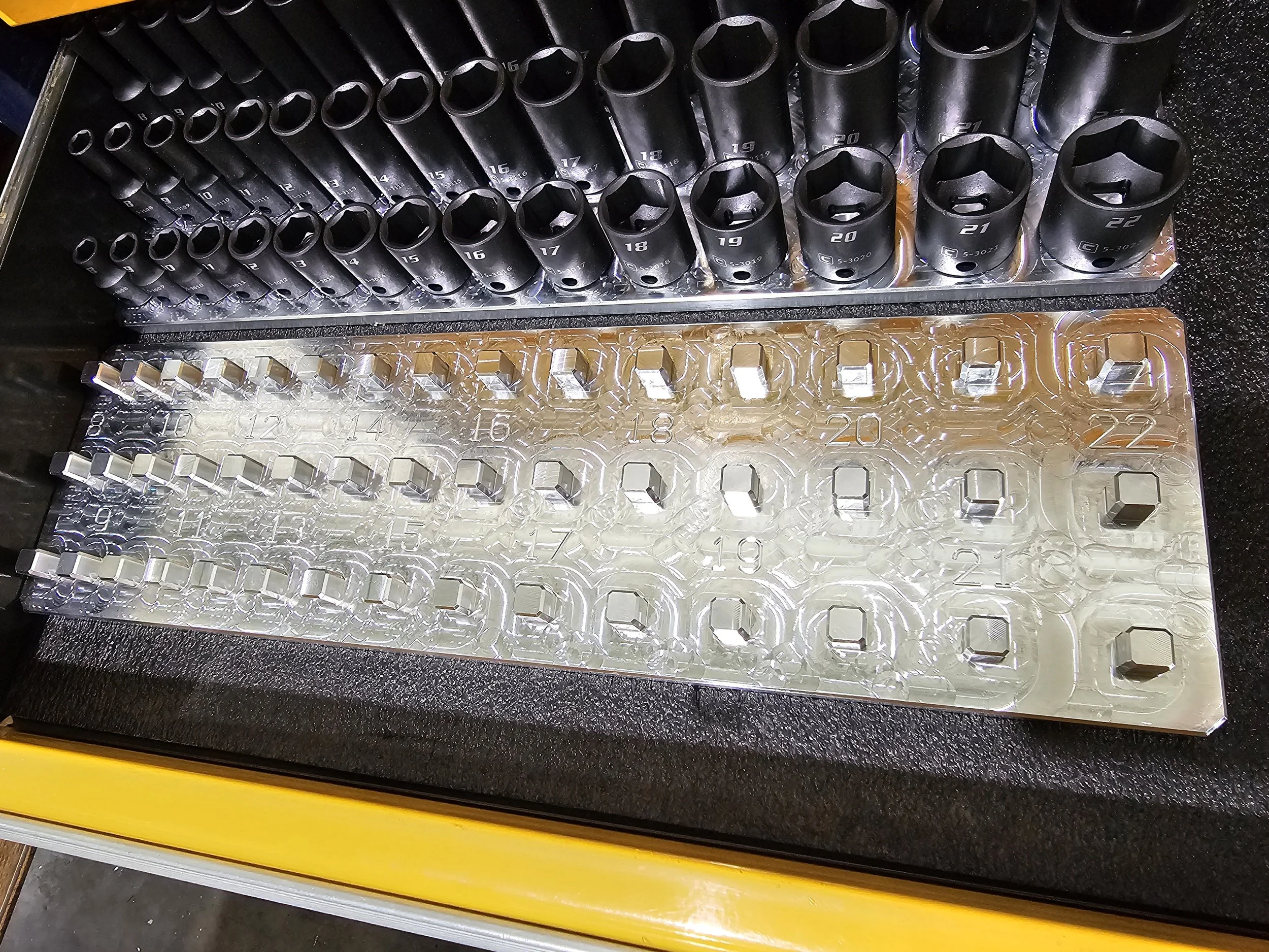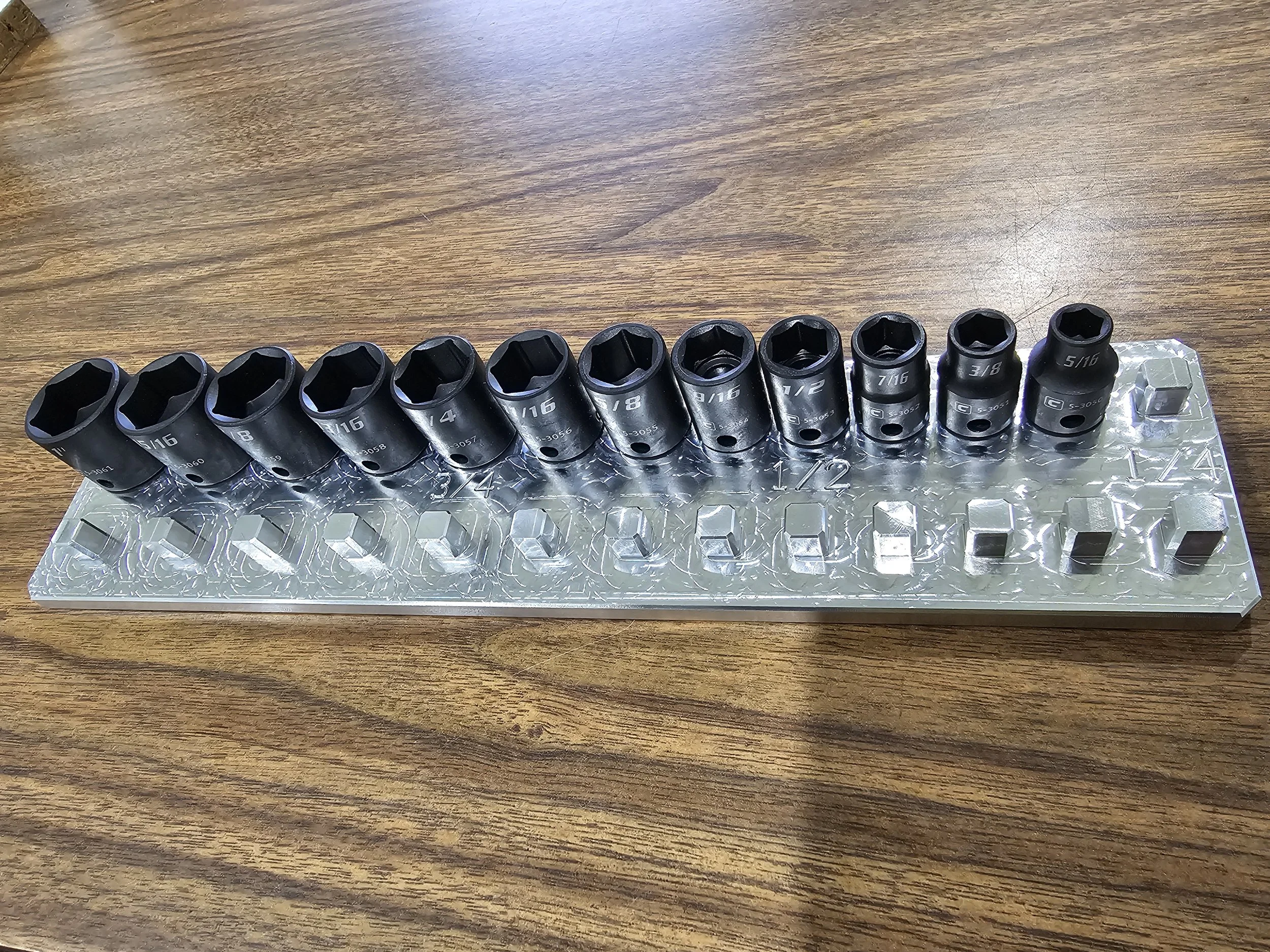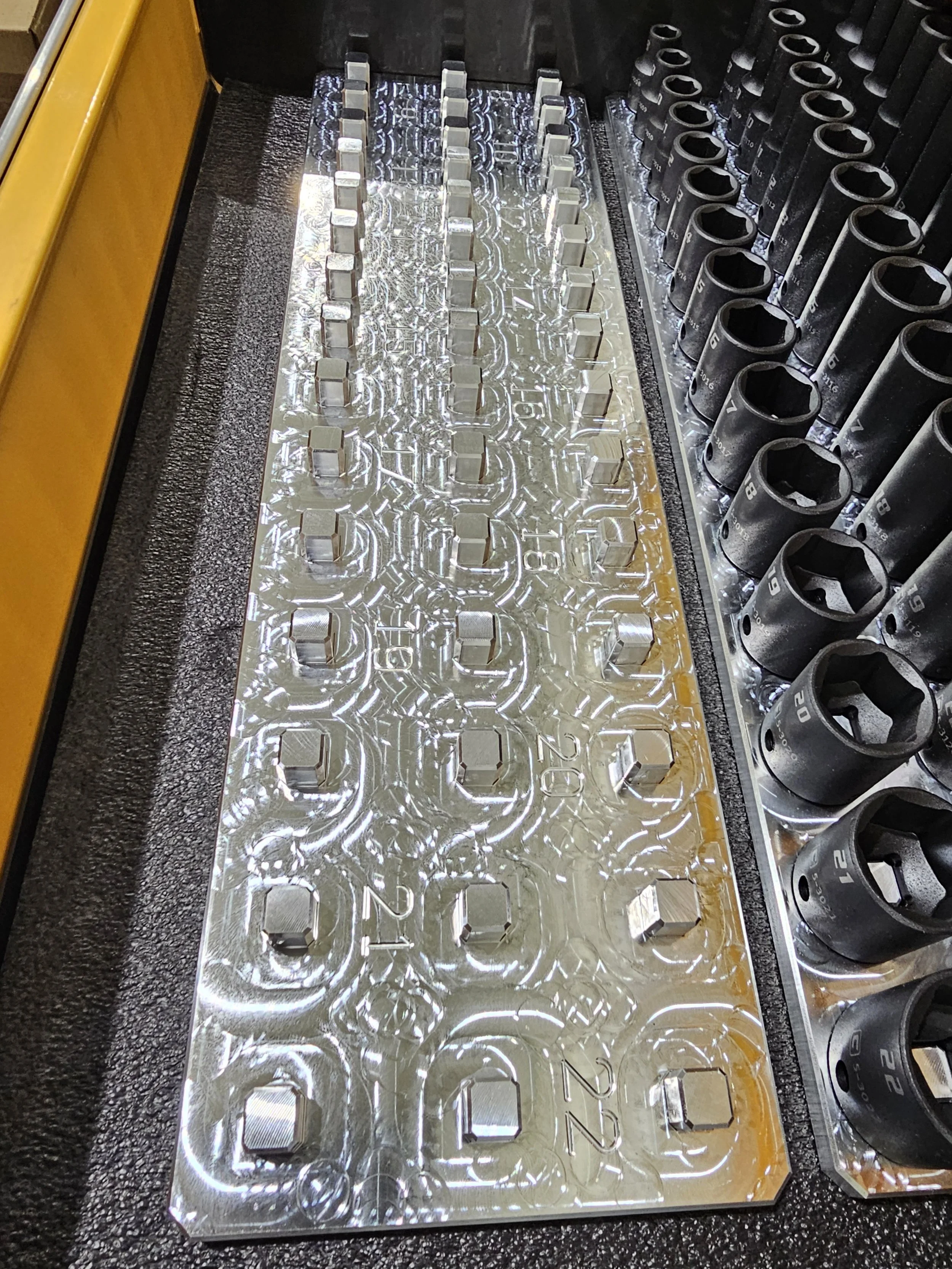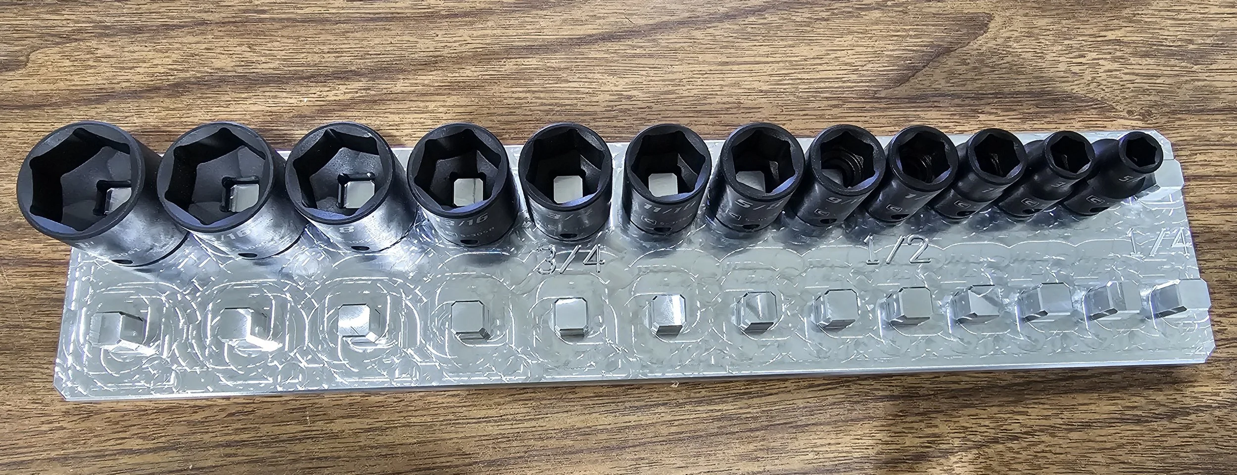 MACHINE IS BACK RUNNING. I WILL HAVE LIMITED STOCK FOR THE NEXT COUPLE WEEKS. THANK YOU TO ALL MY CUSTOMERS Categories: All WRENCH ORGANIZATION TORQUE WRENCH ORGANIZATION EXTENSION ORGANIZATION SOCKET ORGANIZATION All | WRENCH ORGANIZATION | TORQUE WRENCH ORGANIZATION | EXTENSION ORGANIZATION | SOCKET ORGANIZATION | 3/8 & 1/2 Organizer $32.00 Sold out VIM Tools DTPM100 $36.00 20 PC Wrench Organizer ( 2 PC ) $35.00 4 x 10 1/4 Drive Organizer $35.00 1/4 - 2 Row Socket Organizer $26.00 1/4 - 3 ROW SOCKET ORGANIZER $28.00 1/4 - 4 ROW SOCKET ORGANIZER $32.00 3/8 - 2 Row SAE $36.00 3/8 - 2 Row ( METRIC & SAE ) ORGANIZER $60.00 3/8 - 3 Row 8-22MM Socket Organizer $50.00 3/8" - 3 Row 8 - 24 (METRIC) SOCKET ORGANIZER $55.00 3/8 - 3 ROW ( SAE ) SOCKET ORGANIZER $45.00 3/8 - 3 ROW 6-20MM SOCKET ORGANIZER $45.00 3/8 - 3 ROW ( METRIC & SAE ) SOCKET ORGANIZER $80.00 1/2" - 2 ROW ( SAE ) SOCKET ORGANIZER $55.00 1/2" 2 Row ( SAE ) with 1-3/16" ( 15pc ) $55.00 Sold out 1/2" SAE 1-5/16 - 1-5/8 $42.00 Sold out 1/2" - 2 ROW 10-27 ( SKIPS 26 ) Socket Organizer $60.00 1/2" 28 - 36 Metric Socket Organizer $42.00 Blue Point BLPTHC87 Organizer $80.00 Cornwell CBSMTH62S - 62 Piece Hex & Star Bit Organizer $55.00 6" x 6" 1/4 & 3/8 Billet Aluminum Organizer $38.00 Sold out 6" x 6" 3/8 Billet Aluminum Organizer $32.00 6" x 6" Multi Billet Aluminum Organizer $32.00 Billet Aluminum organizer for 204fihc $40.00 Sold out 1/4 Extenion Tray for Icon extensions $35.00 Sold out 1/4 Extension Tray SNAP-ON $36.00 Sold out 1/4 & 3/8 Extension Tray SNAP-ON $60.00 3/8 Extension Tray SNAP-ON $36.00 3/8 Extension Tray for Icon $36.00 Sold out 3/8 Extension Tray Matco 5pc $36.00 Sold out 1/2" Extension Tray SNAP-ON $38.00 Digital Torque Wrench Tray (2Pc) $80.00 Digital Torque Wrench Tray (3 Pc) $140.00 Low Profile Socket Organizer for Snap On sockets $36.00 3/8 Low Profile $46.00 Sold out Tap Socket Holder $30.00 Sold out